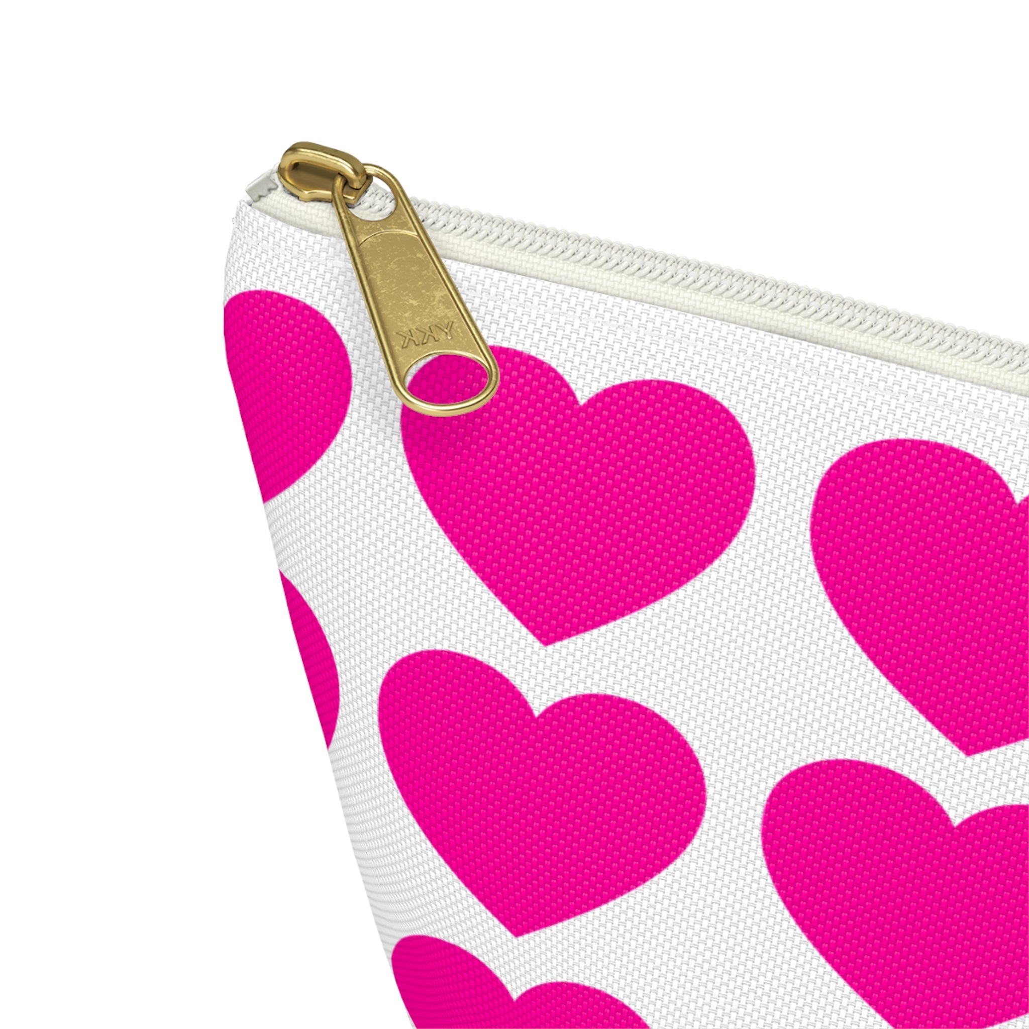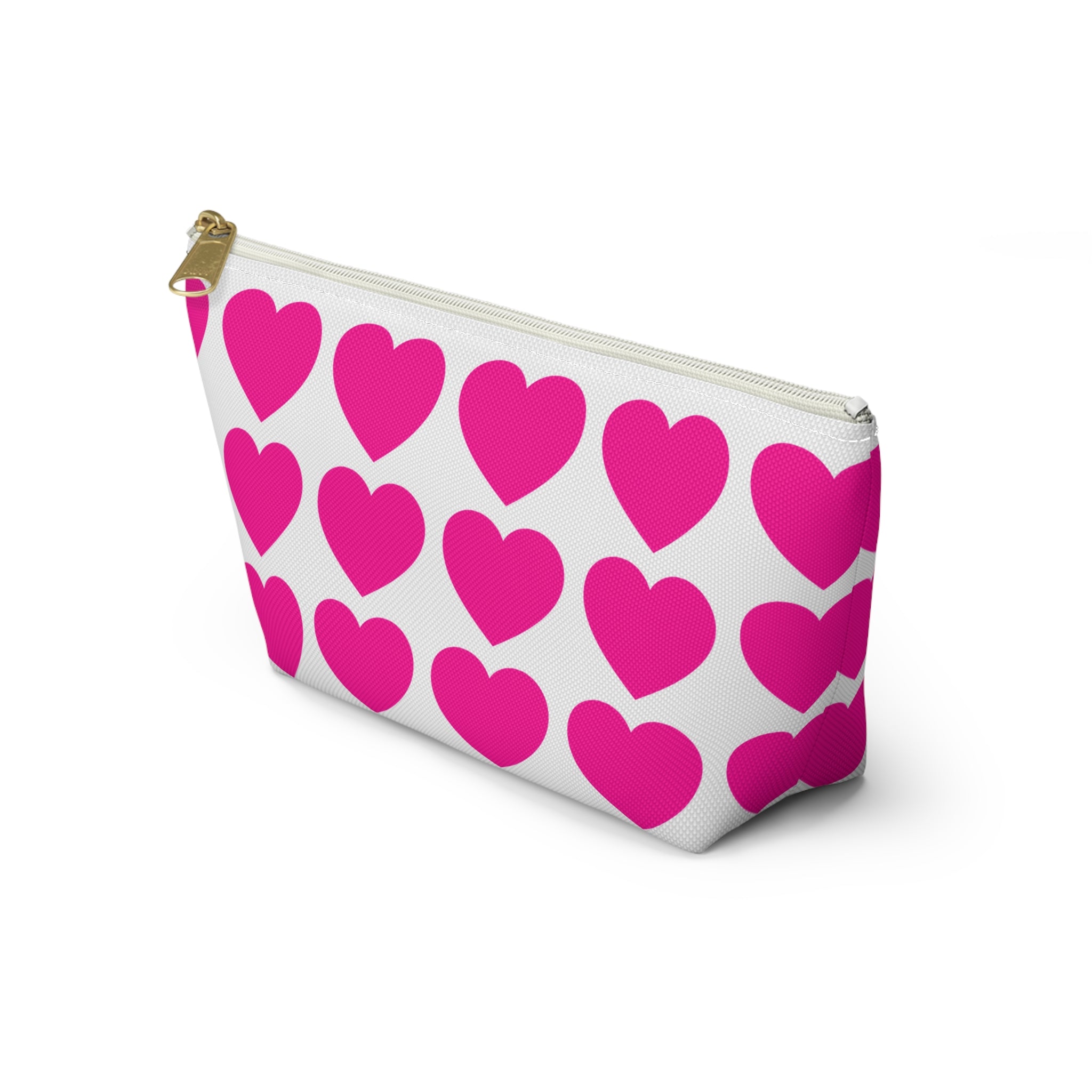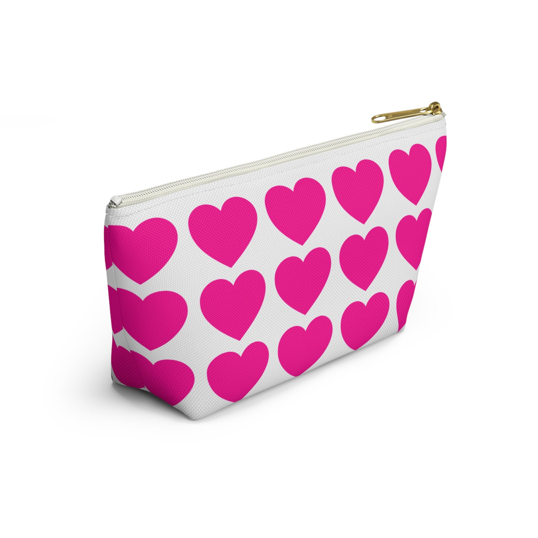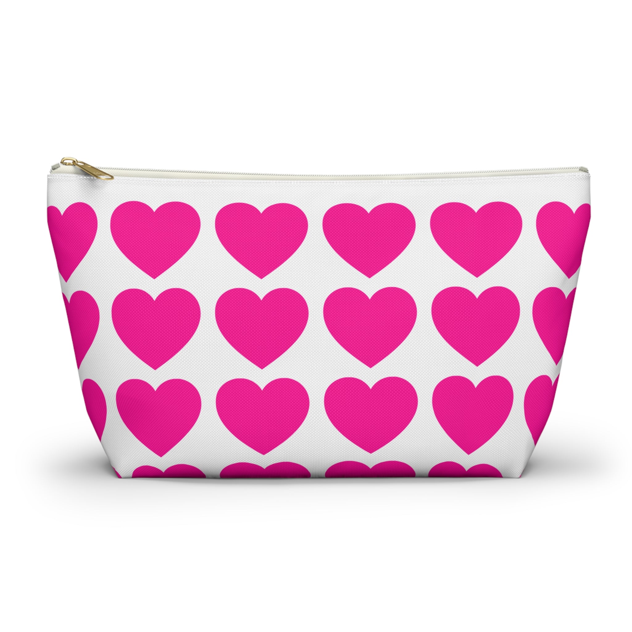 Bright, playful accessory pouch designed to carry small essentials with cheerful style. The structured T-bottom gives it a roomy interior that stands upright on a dresser or in a tote. A repeating pattern of bold hot-pink hearts pops against a crisp white background, bringing a joyful, modern look to makeup, cords, coins, or other everyday items. The interior has a tidy non-woven laminate for clean lines and durability, and a matching zipper with a gold-colored pull adds a subtle touch of polish. Lightweight, wrinkle-resistant polyester keeps the print vivid and the pouch looking fresh with minimal care.